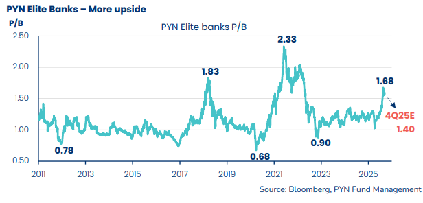 Trên cơ sở mặt bằng giá hiện tại, PYN Elite dự báo P/B của nhóm ngân hàng trong danh mục sẽ giảm về khoảng 1.4 lần vào cuối năm 2025 và tiếp tục xuống 1.2 lần trong năm 2026, phản ánh tốc độ gia tăng mạnh của giá trị sổ sách. Tuy nhiên, theo đánh giá của quỹ, định giá thị trường hoàn toàn có thể được đẩy lên trên 2 lần khi giá cổ phiếu tăng mạnh hơn, nhờ kỳ vọng lợi nhuận cải thiện và chu kỳ tái định giá của nhóm ngân hàng.