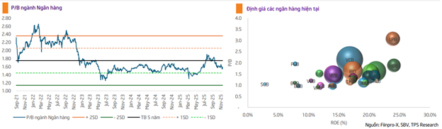 Tuy nhiên, nhóm ngân hàng đang chịu sự điều chỉnh trong 2-3 tháng qua, theo đó, mức định giá P/B trung bình ngành hiện đang ở mức 1.6x (ngày 16/12/2025), tương đương mức trung bình 5 năm giảm 0.6 độ lệch chuẩn (SD). Vì vậy, TPS cho rằng định giá ngành nói chung đã về mức không đắt và có nhiều tiềm năng để được tái định giá lên mức trung bình 5 năm (1.75x lần) nhờ các triển vọng về nền kinh tế tăng trưởng 2 con số sẽ giúp tăng trưởng tín dụng cao và các chính sách mới về xử lý nợ xấu giúp NPL giảm để hoàn nhập dự phòng.