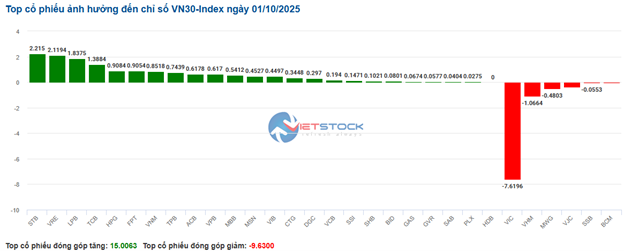 Độ rộng trong rổ VN30-Index với sắc xanh có phần áp đảo hơn. Trong đó, nổi bật ở chiều tích cực có STB, VRE, LPB và TCB với mức đóng góp lần lượt là 2.21 điểm, 2.11 điểm, 1.83 điểm và 1.38 điểm vào chỉ số VN30. Ở chiều ngược lại, các mã như VIC, VHM, MWG và VJC là những cổ phiếu vẫn đang chịu áp lực bán và lấy hơn 9 điểm từ chỉ số chung.