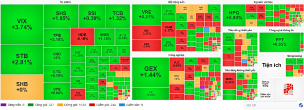 So với đầu phiên, bên mua tiếp tục giữ vị thế lấn lướt hơn. Số mã tăng là 327 mã và số mã giảm là 244 mã.