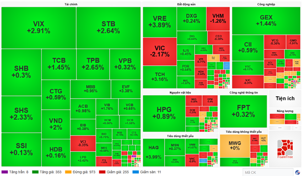 Nhóm tài chính đang chiếm tới 7/10 vị trí trong top cổ phiếu đóng góp tích cực nhất, mang về 4.5 điểm tăng cho VN-Index. Tuy nhiên, nỗ lực này bị triệt tiêu bởi sức ép từ bộ đôi VIC và VHM ở phía ngược lại.