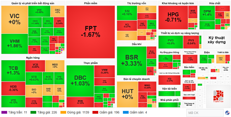 Ngược lại, những “ông lớn” như VHM tăng 1.86%, TCB tăng 1.3%, BSR tăng 3.33%… đang hỗ trợ nhiều điểm số cho VN-Index.