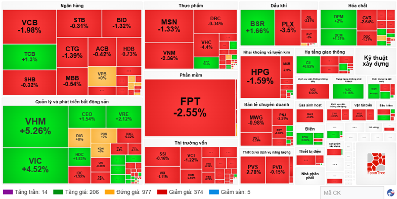 Bên cạnh đó, nhóm công nghệ thông tin với FPT giảm 2.55%; chứng khoán với VCI giảm 1.22%, VIX giảm 1.11%…; thực phẩm với MSN giảm 1.33%, VNM giảm 2.36%, VHC giảm 4.44%…; dầu khí với PLX giảm 3.5%, OIL giảm 2.81%…; hay hóa chất với nhiều cái tên điều chỉnh như GVR giảm 2.64%, DGC giảm 1.31%… Tất cả tạo nên bức tranh ảm đạm vây quanh “ngôi sao sáng” bất động sản.