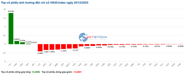 Top 10 cổ phiếu tác động mạnh tới VN-Index phiên 05/12/2025 (tính theo điểm)