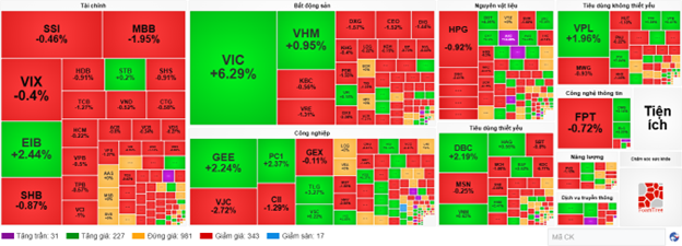 Các mã lớn thuộc họ Vingroup và Gelex như VIC, VHM, VPLGEE đang dẫn đầu nhóm kéo thị trường với tổng mức đóng góp hơn 15.9 điểm. Ở chiều ngược lại, MBB, TCB, HVN, VPB đang đè chỉ số và lấy đi hơn 1.9 điểm.