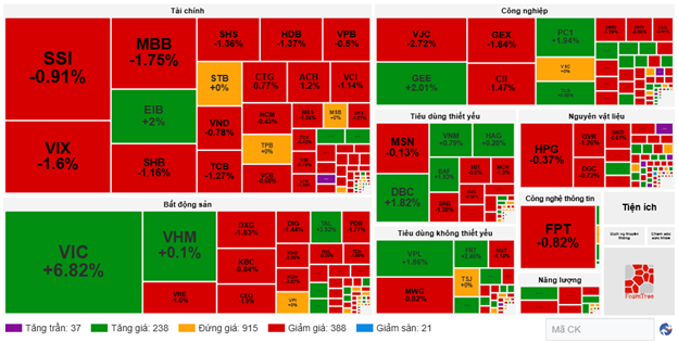 Nhóm bất động sản tuy vẫn giữ được mức tăng trưởng mạnh mất thị trường 2.05% với lực mua chủ yếu đến từ VIC tăng 6.29% và VHM tăng 1.05% nhưng phần còn lại các cổ phiếu vẫn bị bao phủ bởi sắc đỏ trên diện rộng như DXG giảm 1.31%, KBC giảm 0.56%, VRE giảm 1.31%, PDR giảm 1.55%…