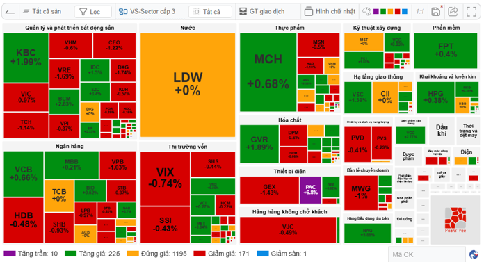 Bản đồ thị trường cho thấy sắc xanh và đỏ phân hóa mạnh trong đa số nhóm ngành, dễ thấy nhất là bất động sản, ngân hàng, chứng khoán, thực phẩm, thiết bị điện. Số ít ngành đang cho thấy xu hướng rõ ràng hơn.