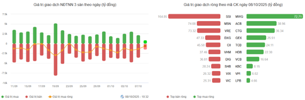 Sau phiên giảm điểm cùng thanh khoản sụt giảm vào hôm qua, VN-Index mở phiên sáng nay tăng mạnh và sắc xanh bao phủ toàn thị trường khi thông báo chính thức được phát đi trong rạng sáng ngày 08/10/2025 từ FTSE Russell về việc phân loại lại thị trường chứng khoán có đề cập đến Việt Nam được nâng hạng từ thị trường Cận biên lên Mới nổi thứ cấp, và thông báo nâng hạng này có hiệu lực từ tháng 9 năm 2026.