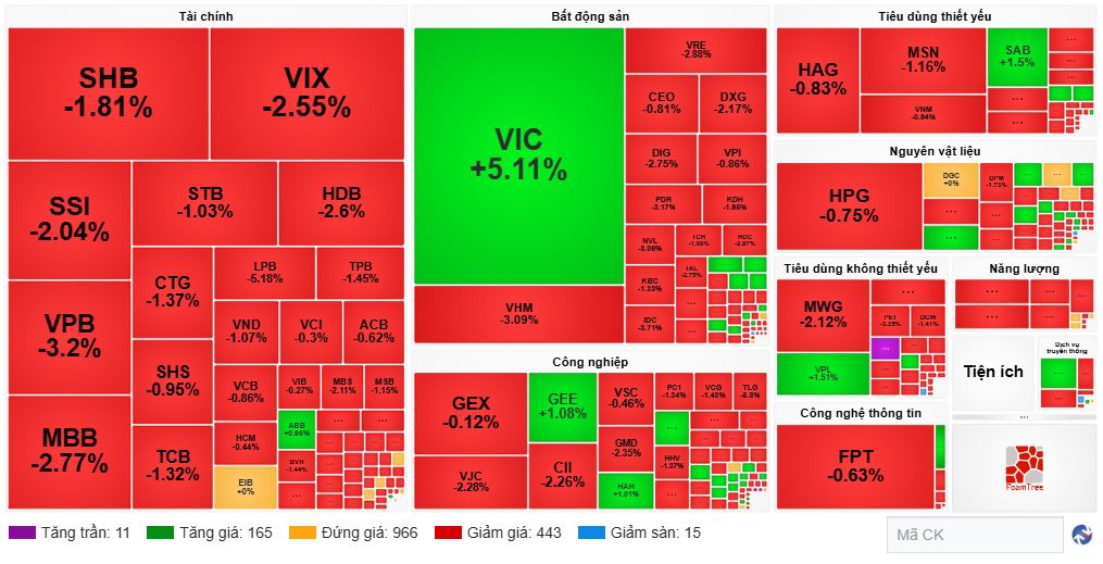 Nhóm tài chính (ngân hàng, chứng khoán, bảo hiểm) và bất động sản đã chìm sâu vào trong sắc đỏ. Bên cạnh đó, các nhóm ngành như năng lượng, dịch vụ viễn thông, truyền thông giải trí đang dẫn đầu mức giảm mạnh.
