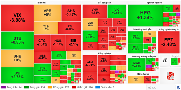 Độ rộng các mã cổ phiếu trong rổ VN30 khá cân bằng nhưng áp lực bán mạnh có phần lấn lướt hơn đã lấy đi hơn 10.4 điểm từ chỉ số chung. Nổi bật với FPT, VIC, VHM và VRE với mức tác động giảm lần lượt là 2.57 điểm, 1.89 điểm, 1.39 điểm và 1.26 điểm. Theo sau là những mã như HDB, VJC, SHB… cũng ghi nhận sự sụt giảm đáng kể.