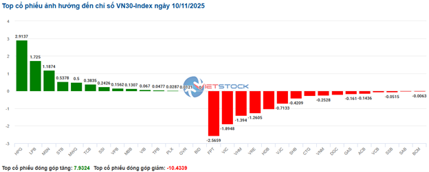 Trong top 10 cổ phiếu ảnh hưởng đến chỉ số VN-Index, VHM là mã có ảnh hưởng tiêu cực nhất khi lấy đi 1.47 điểm của chỉ số. Theo sau là CTG và FPT cũng kéo chỉ số giảm thêm hơn 2 điểm. Ngược lại, VIC, LPB và HPG là ba mã có đóng góp tích cực nhất, đem về tổng cộng gần 2.36 điểm cho chỉ số chung.