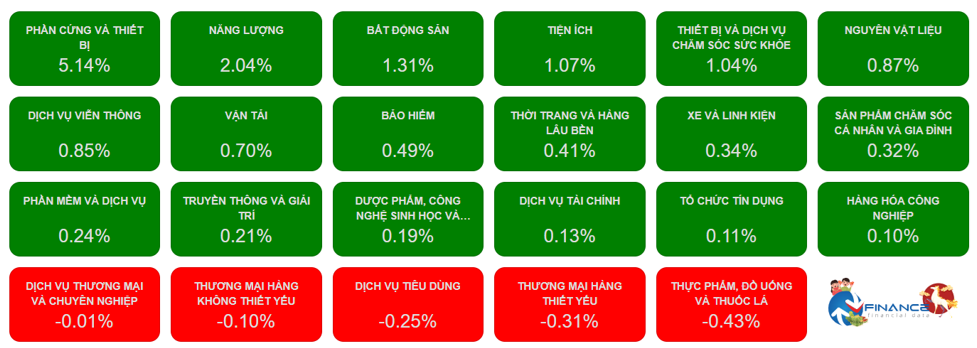 Đa số ngành đều tăng giá hôm nay, nổi bật trong đó là phần cứng và thiết bị tăng 5.14%, năng lượng tăng 2.04%, bất động sản tăng 1.31%, thiết bị và dịch vụ chăm sóc sức khỏe tăng 1.04%. Riêng với bất động sản, VIC tăng 2.45% và trực tiếp mang lại nhiều điểm số cho VN-Index.