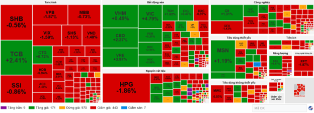 Hàng loạt các cổ phiếu VN30 giảm mạnh như HPG, FPT, VPB, ACB, HDB… Riêng VIC, VHM, VRE, TCBMSN là 5 mã duy nhất trong nhóm le lói sắc xanh.