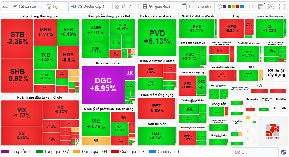 Nhìn vào bản đồ thị trường, dễ thấy sắc xanh nổi bật tại một số ngành, như hóa chất với DGC tăng 4.92%, CSV tăng 4.43%; phân bón với DCM tăng 2.77%, DPM tăng 2.12%, BFC tăng 1.08%; nhóm thực phẩm với MCH tăng 3.25%, DBC tăng 1.33%, VNM tăng 0.5%, hay các cổ phiếu thủy sản như VHC tăng 1.75%, AFX tăng trần 15%; cảng biển với VSC tăng 3.48%; thiết bị điện với GEE tăng 5.44%.
