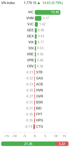 Cổ phiếu VIC tiếp tục thể hiện vai trò trụ cột khi kéo VN-Index tăng tới gần 12 điểm, trong khi, top 10 cổ phiếu đóng góp mạnh cho chỉ số kéo tăng 20 điểm. VIC đang đóng vai trò trụ cột chính với đà tăng của chỉ số sáng hôm nay. Tới 9h35, mã này bật tăng trần và chạm ngưỡng gần 220,000 đồng/cp.