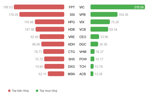Về giao dịch khối ngoại, trạng thái bán ròng tiếp tục được duy trì, quy mô tạm thời hơn 1 ngàn tỷ đồng. FPT, SSI, HPG và HDB là các cổ phiếu bị bán ròng hàng trăm tỷ. Ở chiều ngược lại, VIC và VPB nỗ lực giảm sức ép.