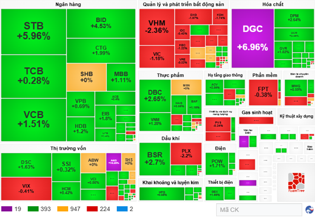 Sắc xanh tiếp tục lan tỏa, đáng chú ý phải kể đến nhóm ngân hàng. Trong đó, VCB tăng 1.51%, CTG tăng 1.99%, hay STB và BID tăng mạnh lần lượt 5.96% và 4.53%. Đây cũng là các mã cổ phiếu đang chiếm lĩnh 4 vị trí dẫn đầu về đóng góp điểm số cho VN-Index, lần lượt BID (3.44 điểm), VCB (2 điểm), STB (1.58 điểm) và CTG (1.27 điểm).