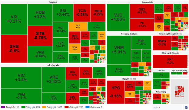 Trong rổ VN30, ngoài 3 cổ phiếu nhà Vingroup, chỉ có VNM tăng 2%, còn lại tăng giảm đan xen quanh mốc tham chiếu. Thậm chí, STB, GAS, TPB và BCM đã điều chỉnh hơn 1%.