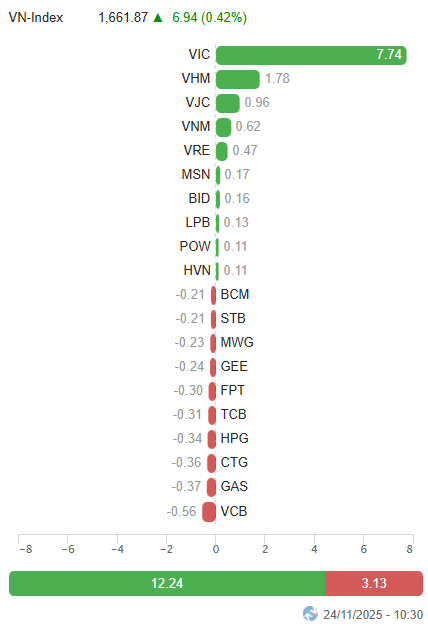Riêng cổ phiếu VIC đang đóng góp đến gần 8 điểm tăng cho VN-Index, còn VHM và VRE đem về thêm hơn 2 điểm. Có thể thấy đà tăng của chỉ số chỉ được dẫn dắt chính bởi nhóm cổ phiếu nhà Vingroup.