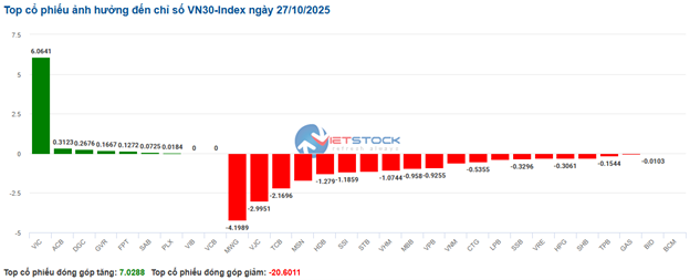 | Top 10 cổ phiếu tác động mạnh tới VN-Index phiên sáng 27/10/2025 (tính theo điểm) | ||