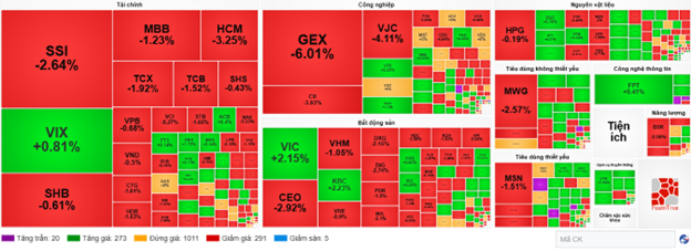 Dòng tiền bất ngờ đảo chiều thoát khỏi nhóm ngành tài chính và công nghiệp với mức giảm lần lượt là 0.9%, 0.54% khiến phần lớn các cổ phiếu trong hai ngành này giảm mạnh. Cụ thể, SSI giảm 2.78%, HCM giảm 3.05%, TCB giảm 1.39%, TCX giảm 1.92%, GEX giảm 5.43%, VJC giảm 3.94%, CII giảm 3.56%…