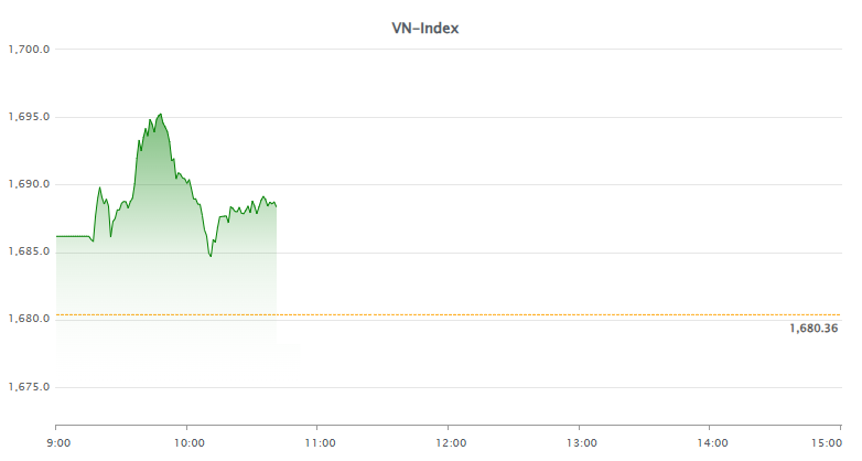 Sau khi sớm tiếp cận ngưỡng 1,695 điểm, VN-Index lập tức gặp áp lực điều chỉnh giai đoạn tiếp theo của phiên sáng. Tính đến 10h40, VN-Index tăng 8.12 điểm lên 1,688.48.