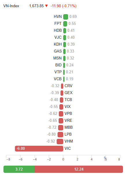 Nhìn vào top 10 cổ phiếu tác động tiêu cực nhất lên VN-Index, bộ đôi VIC và VHM đứng đầu với lần lượt 6.8 điểm và 0.92 điểm lấy đi, ngoài ra còn có VRE lấy 0.65 điểm. Danh sách cũng xuất hiện nhiều cổ phiếu ngân hàng như LPB, MBB, VPB, TCB. Tổng cộng, top 10 này trực tiếp khiến VN-Index đánh mất 12.24 điểm. Trong khi ở chiều hướng đóng góp tích cực, top 10 dẫn đầu chỉ có thể mang về 3.72 điểm.