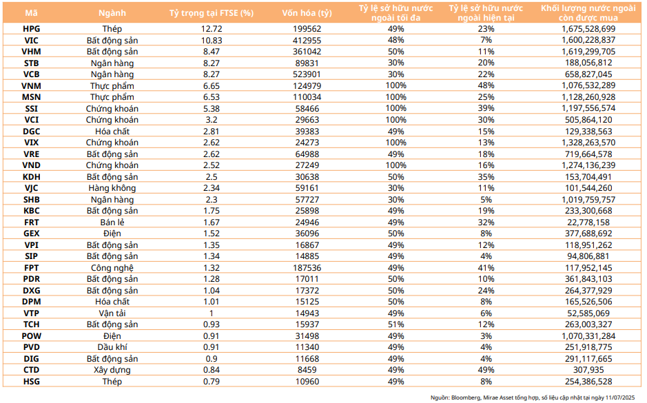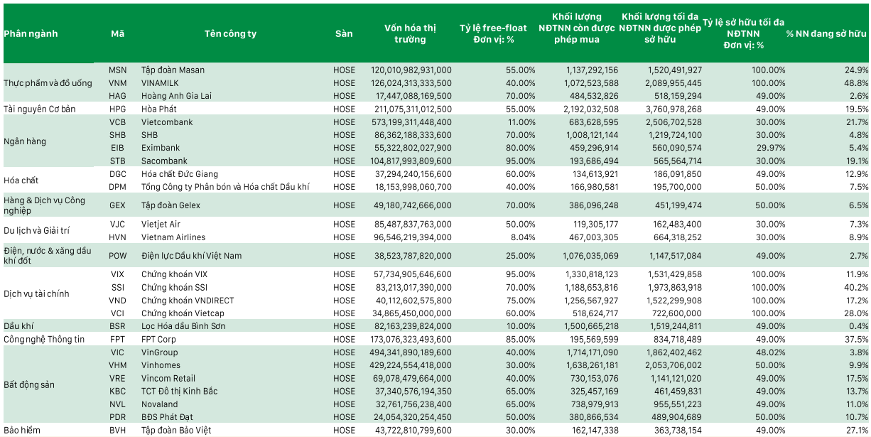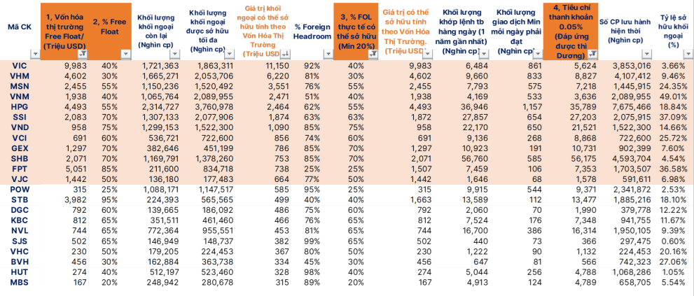 Tương tự, SHS lọc ra 22 cổ phiếu thỏa tiêu chí. Công ty lưu ý rằng, cấu trúc FTSE EM thiên về Large Cap, tập trung nhóm có free-float cao, headroom đủ và room ngoại mở.