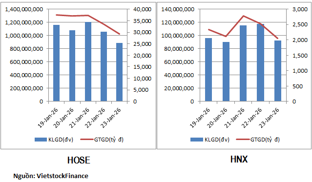 Khối lượng giao dịch và giá trị giao dịch ở cả 2 sàn đều sụt giảm. Ở HOSE, mức giảm 15% đã kéo khối lượng giao dịch về còn gần 1.08 tỷ đơn vị/phiên và giá trị giao dịch còn gần 35 tỷ đồng/phiên. Sàn HNX có phần khá khẩm hơn khi chỉ giảm 6% về khối lượng giao dịch và gần 2% giá trị giao dịch, đạt mức 102.3 triệu đơn vị/phiên và 2.3 ngàn tỷ đồng/phiên.