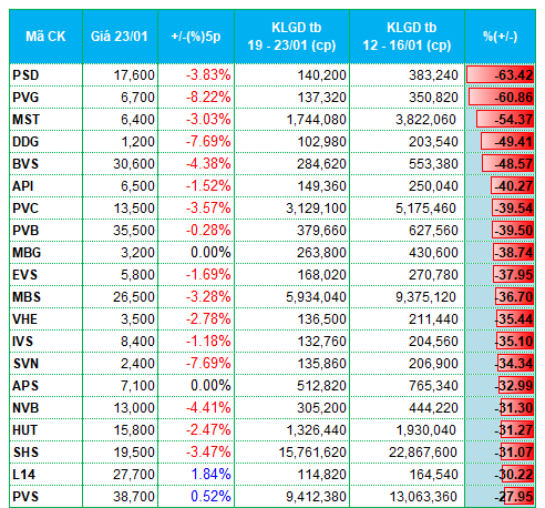 Nhóm chứng khoán cũng có diễn biến tương tự với hàng loạt mã như BSI, FTS, BVS, EVS, MBS, IVS, APS, SHS… lọt top giảm mạnh thanh khoản tuần qua.
