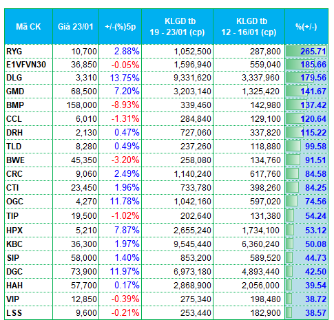 Cụ thể, hàng loạt cổ phiếu xây dựng như CTI, SJE, VC2, LIG hay các mã vật liệu xây dựng gồm RYG, CRC, TLD, BCC… lọt nhóm tăng mạnh thanh khoản trên hai sàn HOSE và HNX. Trong đó, RYG có khối lượng giao dịch tăng tới 265% so với tuần trước, đạt mức hơn 1 triệu đơn vị/phiên.