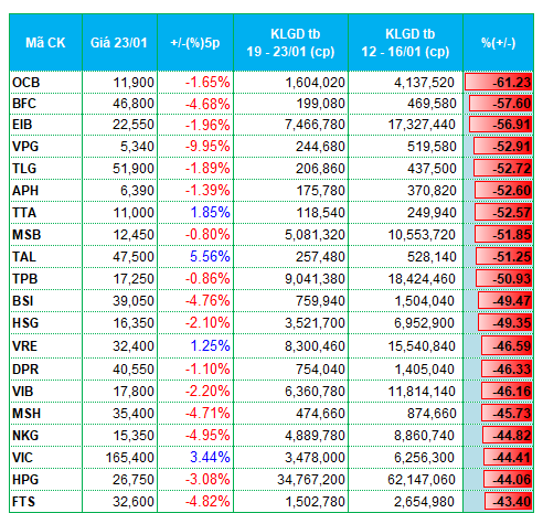 Ngược chiều, không ít cổ phiếu thuộc nhóm ngân hàng, chứng khoán chứng kiến thanh khoản giảm mạnh so với tuần trước. Với nhóm ngân hàng, các đại diện OCB, EIB, MSB, TPB, NVB… có mức giảm thanh khoản từ 30 – 60%.