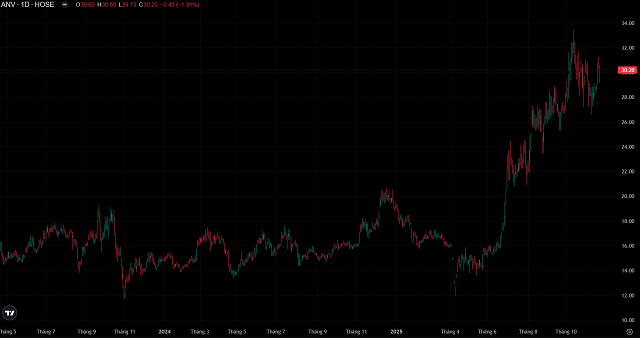 Từ cuối tháng 6/2025, ANV trở thành hiện tượng của ngành khi tăng tốc mạnh mẽ và hiện đạt mức tăng trưởng 54.2%.