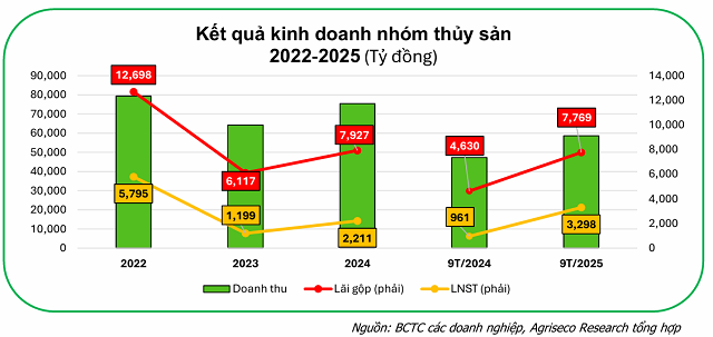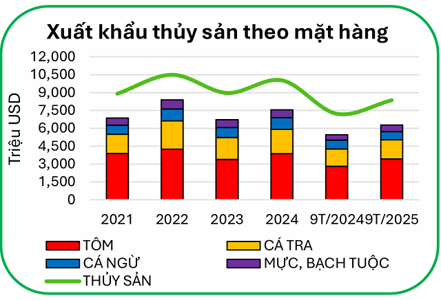 Ở bức tranh rộng hơn, ngành thủy sản ghi nhận sự phục hồi mạnh mẽ cả về sản lượng và lợi nhuận. Xuất khẩu 9 tháng đầu năm đạt 8.3 tỷ USD, tăng 16% so với cùng kỳ, với hầu hết các mặt hàng chủ lực đều tăng trưởng gần hai chữ số.
