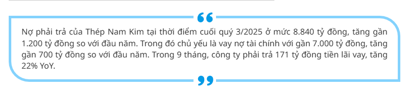 Phần lớn khoản mục xây dựng dở dang của NKG đến từ dự án xây dựng nhà máy thép tấm lợp Nam Kim Phú Mỹ. Vào tháng 7/2025, HĐQT Thép Nam Kim đã phê duyệt điều chỉnh chủ trương đầu tư dự án nhà máy này, do Công ty TNHH Tôn Nam Kim Phú Mỹ – đơn vị thành viên làm chủ đầu tư. Tổng mức đầu tư được nâng từ 5.800 tỷ đồng lên 6.200 tỷ đồng.