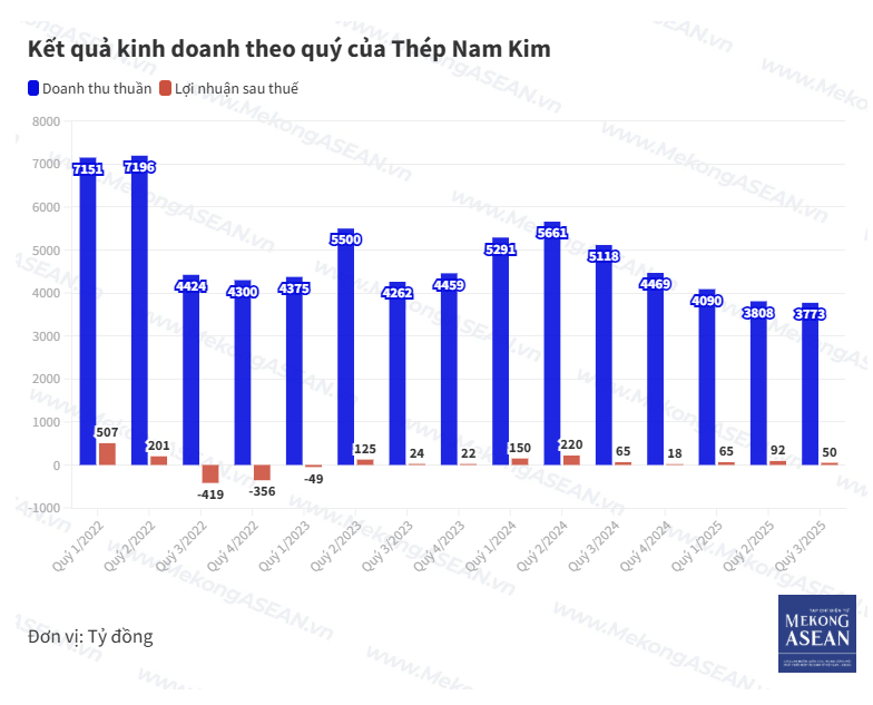 Kết quả, Nam Kim lãi sau thuế 50 tỷ đồng, giảm 23% YoY. Đây là quý lãi thấp nhất của doanh nghiệp trong năm nay và là quý thứ tư liên tiếp lợi nhuận sụt giảm so với cùng kỳ năm trước.
