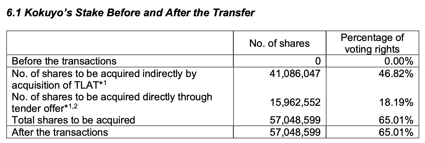 Theo kế hoạch, Kokuyo sẽ mua toàn bộ cổ phần của Công ty Thien Long An Thịnh (TLAT) – đơn vị đang nắm giữ 46,82% cổ phần Thiên Long, thuộc sở hữu của nhà sáng lập và các cộng sự.