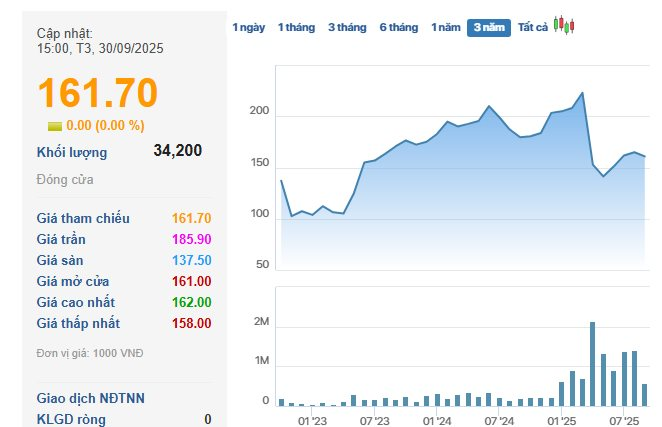 Cổ phiếu có thị giá đạt 161.700 đồng/cp, tương ứng vốn hoá DN gần 3.900 tỷ đồng.