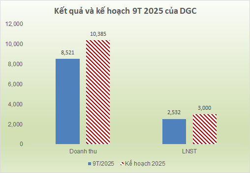 Lũy kế 9 tháng, DGC đạt hơn 8.5 ngàn tỷ đồng doanh thu thuần, tăng 14% so với cùng kỳ; lãi ròng hơn 2.4 ngàn tỷ đồng, tăng trưởng 7%. Qua đó, thực hiện được 82% mục tiêu doanh thu và 84% kế hoạch lãi sau thuế được giao từ ĐHĐCĐ 2025.