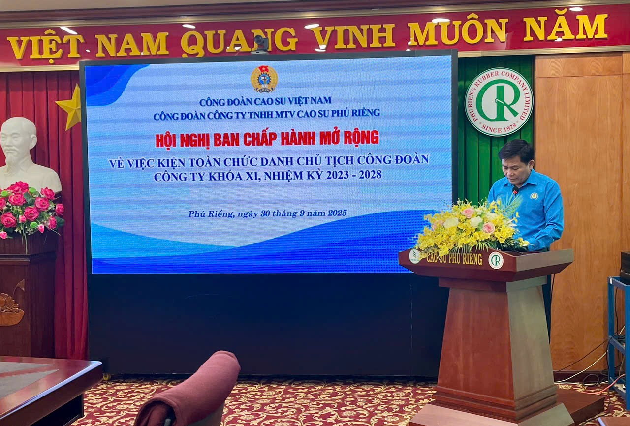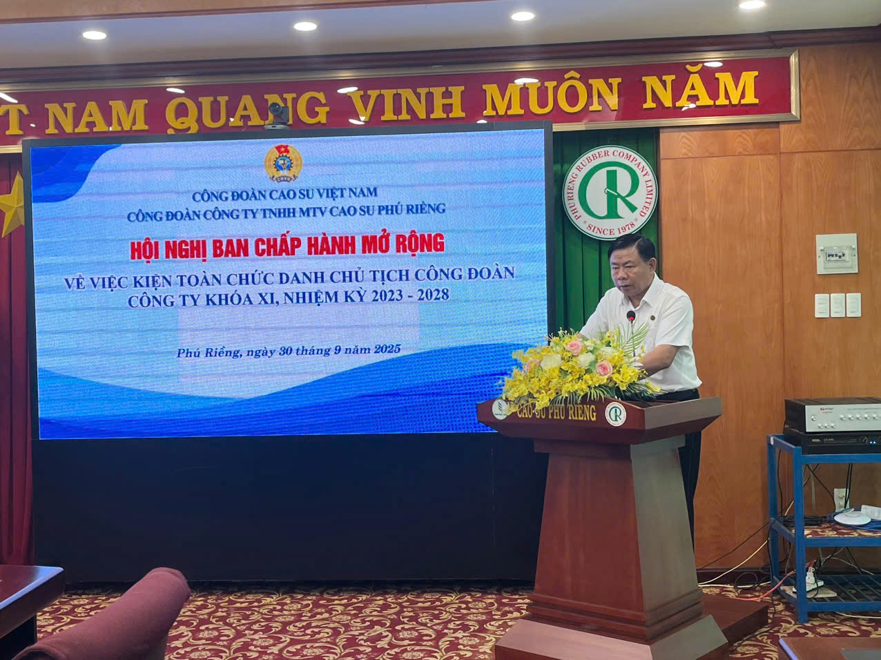 Ngày 30/9/2025, Ban Chấp hành Công đoàn Công ty TNHH MTV Cao su Phú Riềng tổ chức Hội nghị Ban chấp hành mở rộng về việc kiện toàn chức danh Chủ tịch Công đoàn Công ty khoá XI, nhiệm kỳ 2023 – 2028.
