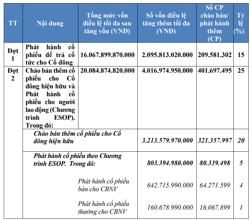 Ngân hàng dự kiến sử dụng 2,096 tỷ đồng để phát hành cổ phiếu trả cổ tức cho cổ đông với tỷ lệ 15%; phát hành cổ phiếu ESOP tỷ lệ 1%, tương đương 160 tỷ đồng.