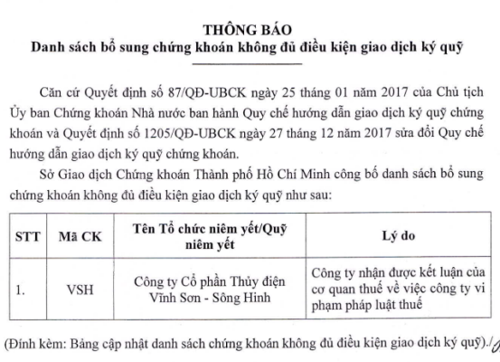 Ngày 01/07, Sở Giao dịch Chứng khoán TPHCM (HOSE) thông báo bổ sung chứng khoán VSH của CTCP Thủy điện Vĩnh Sơn - Sông Hinh vào danh sách không đủ...