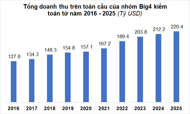 Năm tài chính 2025, nhóm Big4 kiểm toán tại Việt Nam đạt doanh thu gần 3.5 ngàn tỷ đồng và lãi sau thuế hơn 200 tỷ đồng, mức cao nhất...