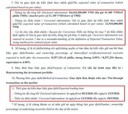 Ngày 06/03, tổ chức đến từ Singapore là JWD Asia Holding Private Limited (JWD Asia) - cổ đông lớn CTCP Transimex (HOSE: TMS) - đính chính thông báo giao dịch...
