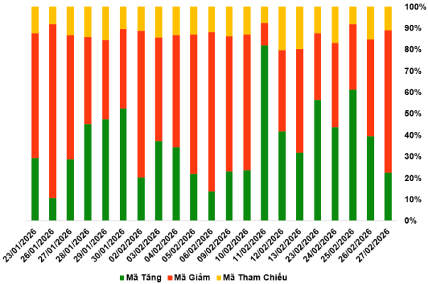 Kết thúc phiên giao dịch ngày 27/02/2026, toàn thị trường có 71 mã tăng, 210 mã giảm và 34 mã tham chiếu. Khối ngoại tiếp tục mua ròng với tổng...