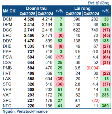 Với nhiều động lực tăng trưởng, các doanh nghiệp phân bón kết thúc năm 2025 tương đối thành công với mức tăng trưởng mạnh. Trong khi đó, nhóm doanh nghiệp...