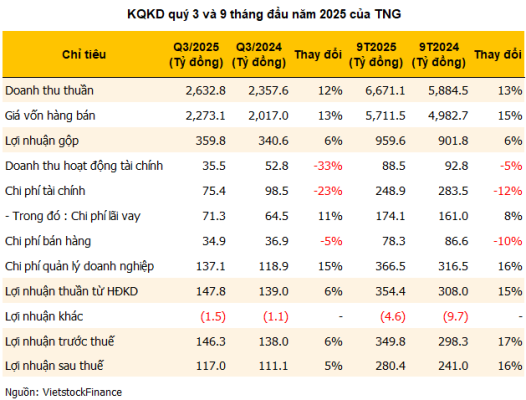 CTCP Đầu tư và Thương mại TNG (HNX: TNG) tiếp tục duy trì đà tăng trưởng sau quý 2 kỷ lục, khi doanh thu và lợi nhuận quý 3/2025 cùng...