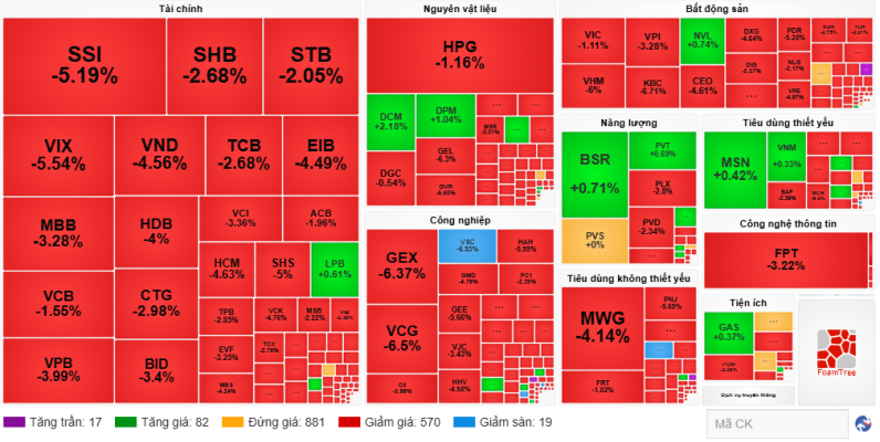 Chưa xuất hiện nỗ lực phục hồi nào, thị trường tiếp tục chìm trong sắc đỏ về cuối phiên sáng. Tạm nghỉ giữa phiên, VN-Index giảm hơn 34 điểm (-2.08%),...