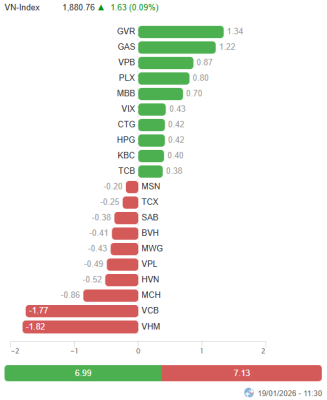 Áp lực bán bất ngờ gia tăng khiến VN-Index nhanh chóng lùi về sát mốc tham chiếu vào cuối phiên sáng. Tạm nghỉ giữa phiên, VN-Index chỉ còn tăng 1.63...