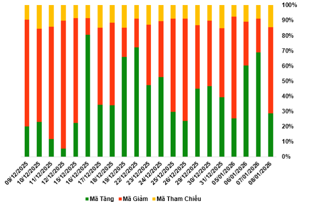 Kết thúc phiên giao dịch ngày 08/01/2026, toàn thị trường có 73 mã tăng, 146 mã giảm và 36 mã tham chiếu. Khối ngoại quay lại mua ròng với tổng...